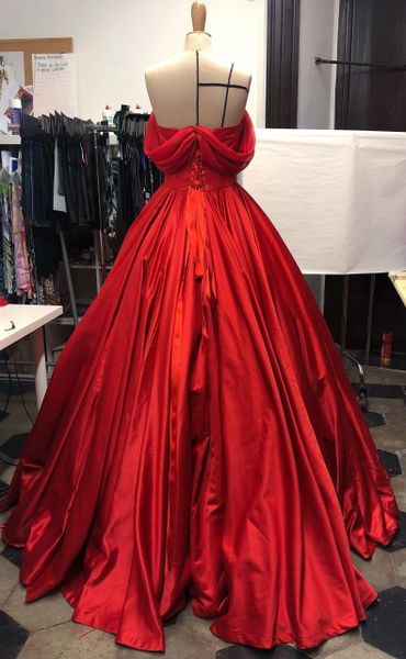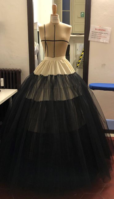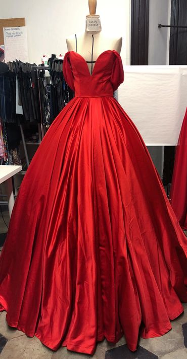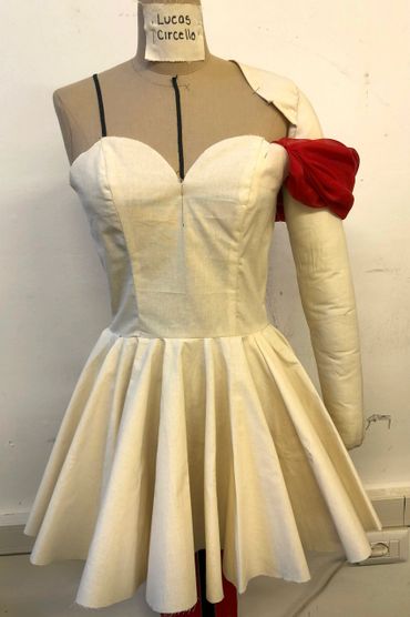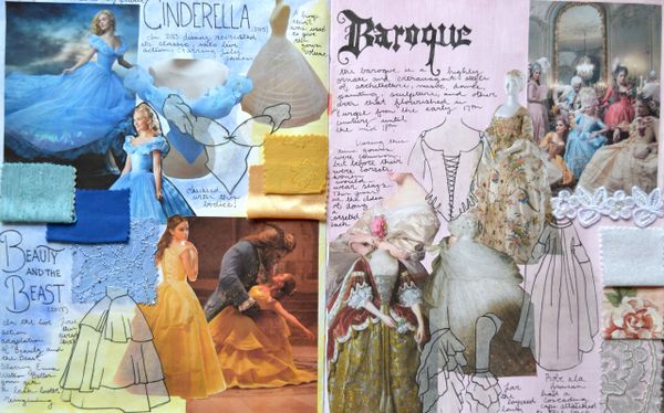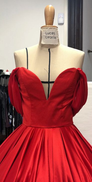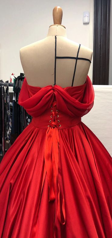 For this conceptual evening wear ensemble created for the Go Red for Women foundation. The juxtaposition between women in power in historical context v. cinematic depictions is explored. From Greek goddess', to unsuccessful queens such as Mary Queen of Scots and Marie Antoinette, to successful queens such as Cleopatra and Elizabeth I. These rulers are compared to Disney's "evil queen" mantra, and the stereotypical 'damsel in distress'. Silhouette inspiration is pulled from the cinematic recreations of Disney classics 'Cinderella' and 'Beauty and the Beast' as well as 17th century Baroque fashion, and Paolo Sebastians 2018 spring/summer collection inspired by the essence of Disney. Adorned in satin upholstery and silk organza this off-the-shoulder sweetheart-neckline ballgown with lace up back is accompanied by a tulle hoop-skirt.